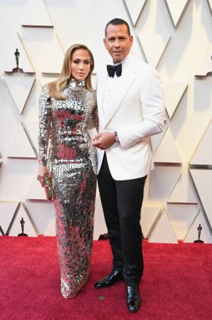 На красную дорожку Джей Ло ступила в необычном длинном платье от Tom Ford, целиком покрытым блестящими пластинками серебряного цвета. Конечно же, ее сопровождал возлюбленный Алекс Родригес, нарядившийся в черно-белый смокинг.