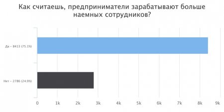 Чуть меньшее количество, но все же большинство, считают, что предприниматели зарабатывают больше наемных сотрудников.