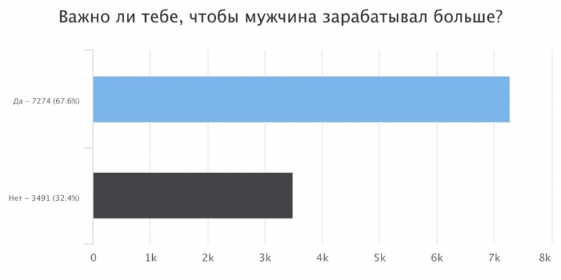 Тем не менее, если спросить женщин о том, важно ли им, чтобы зарплата их конкретного партнера была солиднее, цифра оказывается существенно меньше — 67.6%. То есть в реальной жизни мы более снисходительны к успешности любимого мужчины.