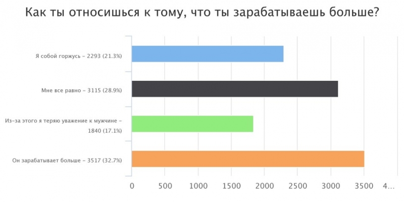 Те дамы, которые все же зарабатывают больше, в основном не переживают из-за этого. 28.9% сообщают, что им все равно, и только 17.1% теряют уважение к своему партнеру, если его доход меньше.