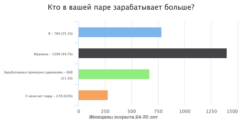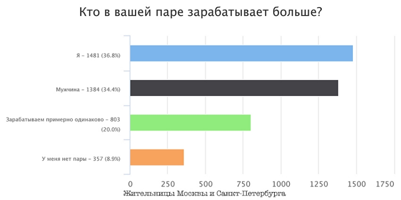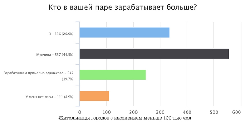 Феминизм говорит — будь самостоятельной. Патриархат — о тебе должен позаботиться мужчина. Мы решили выяснить, могут ли и хотят ли российские женщины зарабатывать сами.Как показал опрос, проведенный на сайте и в котором приняли участие 11 517 человек, отношение к тому, кто сколько должен зарабатывать в семье, зависит от места проживания и возраста женщин. В целом, 83.1% прошедших опрос считают, что мужчина должен зарабатывать больше. Очевидно, влияние стереотипа о «кормильце семьи» на женские умы по-прежнему сильно. Тем не менее, если спросить женщин о том, важно ли им, чтобы зарплата их конкретного партнера была солиднее, цифра оказывается существенно меньше — 67.6%. То есть в реальной жизни мы более снисходительны к успешности любимого мужчины. Судя по статистике, женщинам важно зарабатывать самим: 72.6% ответили, что не хотели бы бросать работу после замужества. А 89.4% опрошенных и вовсе считают, что женщина должна быть финансово независимой. Напрашивается вывод, что российские женщины на мужчину надеются, но сами не плошают. И в основном, становятся надежной поддержкой и опорой своему спутнику — по крайней мере, в материальном плане. Те дамы, которые все же зарабатывают больше, в основном не переживают из-за этого. 28.9% сообщают, что им все равно, и только 17.1% теряют уважение к своему партнеру, если его доход меньше. Что касается реального положения дел, то в парах, живущих в регионах, чаще всего мужчины зарабатывают больше. 44.5% проголосовавших заявляют об этом. И только 34.4% жительниц столиц (Москва, Санкт-Петербург) сообщили, что их партнеры зарабатывают больше. Таким образом мы видим, что доход столичных женщин чуть солиднее. Двигай курсор вправо-влево, чтобы сравнить слайды: Интересная статистика наблюдается, если посмотреть на возраст женщин, проходивших опрос. На вопрос, «кто больше зарабатывает в вашей паре», 44.7% женщин возраста 24-30 лет ответили, что мужчина. Так же ответили 38.9% более взрослых читательниц, которым от 31 до 39 лет. Получается, чем взрослее женщины, тем больше увеличивается вероятность, что они будут зарабатывать больше своего партнера.
