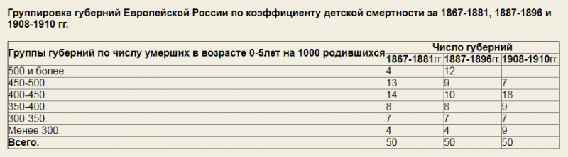 В Российской Империи на рубеже веков (1895 — 1905) смертность детей до 1 года жизни составляла 274 (то есть 27%), до 5-ти лет — 389(38,9%). Во многих губерниях, в том числе Европейской части, — более 500.