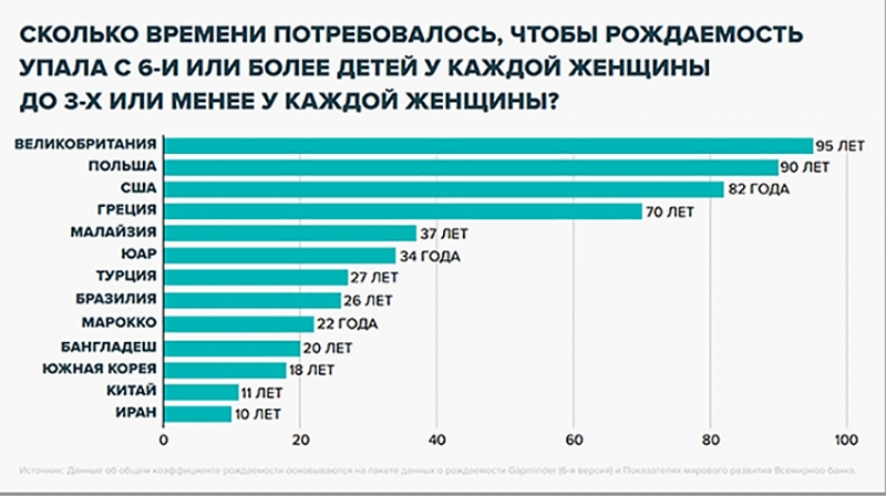 У второго демографического перехода два свойства. Во-первых, он наступает для всех и не щадит никого. Нет такой цивилизации, религии и национальности, тем более «ментальности» (это вообще ненаучное понятие), которая защитила бы нас от второго демографического перехода, или помогла от него оградиться. Во-вторых, чем дальше, тем быстрее происходит этот переход. Например, Великобритания: практически 100 лет понадобилось для того, чтобы число детей на одну женщину снизилось с шести до менее трех. В Иране это произошло за 10 лет, в Китае — за 11.