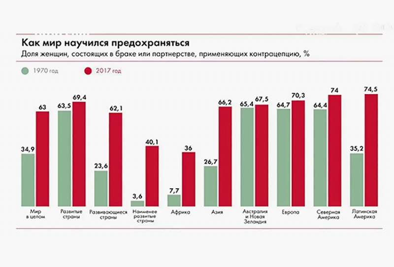 Данные исследований подтверждают, что второй демографический переход не смотрит на наше историческое наследие и «ценности»: как только люди узнают о том, что можно предохраняться, они начинают это делать. Вот график, показывающий число женщин, состоящих в браке, которые пользуются контрацептивами: динамика с 1970 по 2017 год. В развитых странах динамика не особенно велика. Если еще в Европе есть повышение, то в США, религиозной и патриархальной стране, особенного повышения по сравнению с 1970 годом нет. Это противоречит нашим стереотипным представлениям о США, однако полезно помнить, что это религиозное и традиционалистское общество с высокой коннективностью (интенсивностью связей), довольно патриархальное (поскольку женщины там относительно недавно стали массово работать, и социум к этому новому удивительному явлению еще не до конца адаптировался), и что для нас непривычно — общество, в котором религия и организованные церковные общины играют чрезвычайно важную роль и определяют в значительной степени поведение людей.