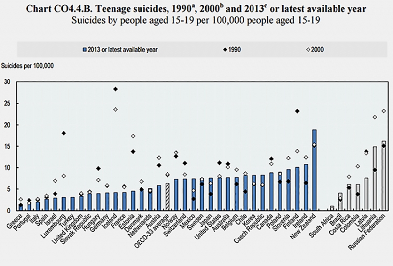 Смотрите: вот данные по самоубийствам с 1960 по 2016 годы. Яма на графике — влияние недооцененной антиалкогольной кампании. Этот социальный эксперимент, повлиявший на снижение убийств и самоубийств, недооценен. Из этого не следует, что надо объявлять «сухой закон»: кампания проводилась идиотскими методами и спровоцировала рост организованной преступности. Вывод в другом. Сейчас в России идет довольно радикальное снижение алкоголизации, и это лучшее, что происходит в России. Потому что это коррелирует и с насилием против женщин, и с убийствами, и с самоубийствами, и с сексуальным насилием, бытовыми убийствами, когда «трое пили — двух убили», и со смертностью в ДТП — это происходит в основном по пьяни. Около 36 тысяч человек в год гибнут на дорогах — чудовищная цифра, что немало вносит свой вклад в раннюю высокую мужскую смертность.