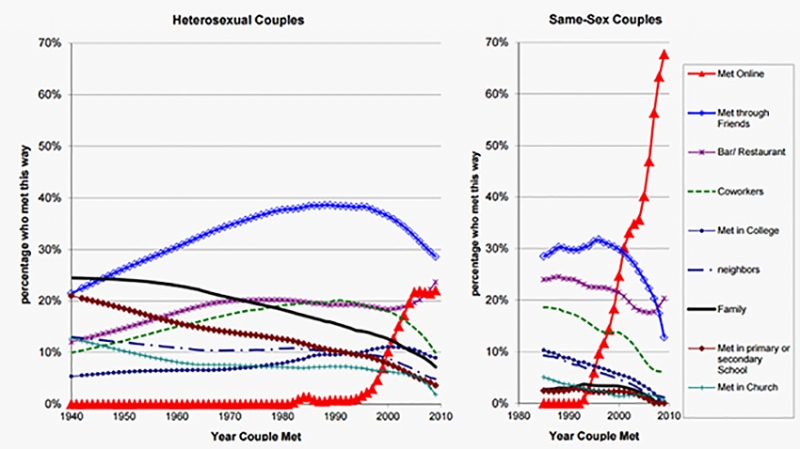 Но экономическая основа семьи — не единственное целеполагание для заключения браков, так что браки продолжают заключаться. На графике представлены способы, которыми познакомились люди, образовавшие устойчивую пару. Левый график — гетеросексуальные пары, правый — однополые. На смену традиционному способу знакомства через семью в XX веке приходят два других института — работа и учеба. Начиная с 90-х угрожающе быстро растет количество познакомившихся онлайн.