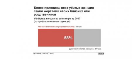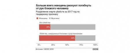 Ежедневно в мире убивают 137 женщин. Журналисты Би-би-си собрали истории убийств, произошедших на разных континентах только в один день. Новые данные ООН говорят о том, что местом убийства женщин чаще всего становится родной дом, а убийца чаще всего — родной и близкий человек.Как следует из отчета, опубликованного управлением ООН по наркотикам и преступности (UNODC), ежедневно во всем мире 137 женщин гибнут от рук своих близких и родственников. По данным ООН, местом убийства женщин чаще всего становится родной дом. Более половины из 87 тысяч женщин, убитых в 2017 году, стали жертвами самых близких людей. Из них около 30 тысяч погибли от рук партнера — мужа или сожителя — и еще 20 тысяч были убиты родственниками. Мужчин по-прежнему убивают больше, чем женщин Данные, собранные управлением ООН по наркотикам и преступности, свидетельствуют о том, что для мужчины вероятность погибнуть в результате умышленного убийства в четыре раза выше, чем для женщины. ООН указывает на то, что во всем мире в 8 из 10 случаев жертвами убийства становятся мужчины. При этом в том же отчете говорится, что более 80% жертв преступлений, совершенных членами семьи против родственников — женщины. BBC. «Насилие со стороны близких людей продолжает непропорционально тяжело сказываться именно на женщинах», — говорится в отчете ООН. 47 женщин в 21 стране за один день В отчете ООН обобщается статистика убийств за 2017 год, полученная из государственных источников. Число убийств женщин и девочек на гендерной почве было выведено на основе критериев убийств, совершенных родственниками или близкими людьми. Time назвал «человеком года» женщин, рассказавших о насилии. В США мужчина врезался на самолете в свой дом после ссоры с женой. После этого создатели спецпроекта Би-би-си «100 женщин» совместно со Службой мониторинга Би-би-си решили побольше узнать о реальных историях женщин, которые скрываются за цифрами статистики. В результате были отслежены все статьи в мировой печати, касающиеся убийств женщин за 1 октября 2018 года. Журналисты Би-би-си, работающие в разных регионах мира, насчитали 47 таких сообщений о женщинах, убитых в 21 стране, скорее всего, по гендерной причине. Большая часть этих убийств пока находится на стадии расследования. Вот лишь шесть таких случаев. Изначально о них сообщалось в местной прессе. Би-би-си получила официальное подтверждение изложенных здесь фактов. Джудит Чесанг, 22 года, Кения В понедельник 1 октября Джудит Чесанг и ее сестра Нэнси собирали в поле урожай сорго. Джудит, мать троих детей, недавно развелась со своим мужем Лабаном Камуреном и решила вернуться в родительскую деревню на севере страны. Вскоре после того как сестры приступили к сбору урожая, Камурен приехал на семейную ферму, напал на бывшую жену и убил ее. По словам местной полиции, после этого самого Камурена убили местные жители. В докладе ООН говорится, что в Африке женщины больше всего подвержены риску убийства со стороны близких или родственников. В общей сложности на 100 тысяч человек приходится 3,1 таких смертей. А по общему числу убийств женщин родственниками и близкими лидирует Азия: там в 2017 году погибли 20 тысяч женщин. Неха Шарад Чодури, 18 лет, Индия Неха Шарад Чодури, вероятно, погибла в результате так называемого убийства чести в день, когда ей исполнилось 18 лет. Она праздновала свой день рожде