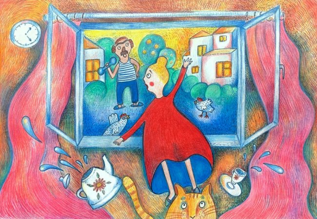 Или вот жила-была другая девушка. И ее тоже пришли сватать в 18 лет. И она сидела за столом вся нарядная и молчала, глядела в ботинок жениха. А потом вышла в кухню поставить чайник и там сбежала через окно к женатому соседу (в этом месте я представляла, как она вылезает в окно, а там стоит наш немолодой сосед Г. в засаленной майке и усах и делает зарядку).