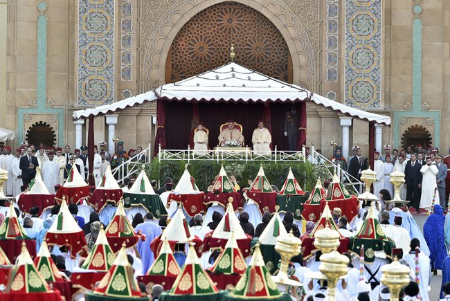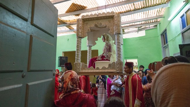 На протяжении всего торжества молодожены переодеваются в новые наряды — не меньше семи раз. Каждое их возвращение сопровождается восклицаниями гостей и аккордами марокканского оркестра.