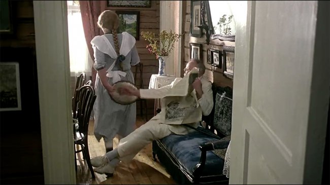 И зрителям смешно: бывший дворянин по старой привычке распускает руки при виде дворовой девки, а та, зная нрав хозяина, успевает прикрыться, подставить под его ладонь металлический поднос. Дзинь! «Ох, е-мое! Да, наш комдив прав — совершенно сумасшедший дом!».